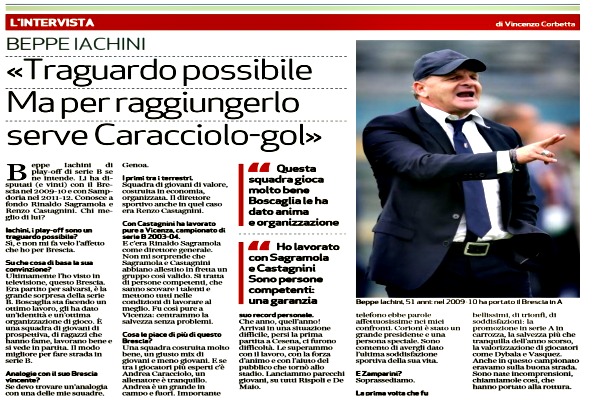 Intervistato ai microfoni di “Brescia Oggi” l’ex tecnico rosanero Beppe Iachini durante un’intervista incentrata maggiormente sul Brescia, ha rilasciato anche una breve dichiarazione sui suoi due anni trascorsi al Palermo. Ecco le sue parole: «Sono stati due anni e mezzo bellissimi quelli trascorsi a Palermo, di trionfi, di soddisfazioni: la promozione in serie A in carrozza, la salvezza tranquilla dell’anno scorso, la valorizzazione di giocatori come Dybala e Vasquez. Anche in questo campionato eravamo sulla buona strada. Sono nate in comprensioni, chiamiamole così,che hanno portato alla rottura. Se il Brescia raggiungerà i playoff? E perchè non dovrebbe? Ha tutto per riuscirci».