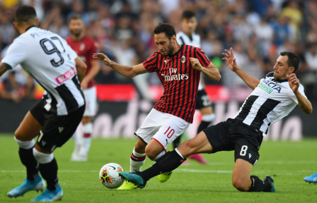 UDINE, ITALY - AUGUST 25: Hakan Calhanoglu of AC MIlan competes for the ball with Mato Jajalo of Udinese Calcio during the Serie A match between Udinese Calcio and AC Milan at Stadio Friuli on August 25, 2019 in Udine, Italy. (Photo by Alessandro Sabattini/Getty Images)
