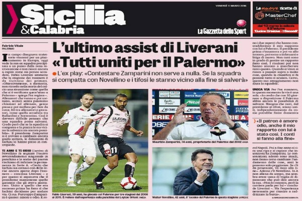 «Obiettivamente, a memoria non ricordo nella storia del calcio una situazione come quella che si è verificata quest’anno a Palermo. Allenatori che vanno e poi tornano, tecnici senza patentino chiamati ad allenare, gente presa e poi mollata per fare da tutor, liti tra giocatori e allenatori come quella accaduta tra Sorrentino e Ballardini. Così è davvero difficile pensare che una squadra possa salvarsi. Credo però che se la squadra si compatta e la piazza le sta vicino la salvezza sia ancora possibile». Queste sono state le parole rilasciate a “La Gazzetta dello Sport” dall’ex rosanero Fabio Liverani.
