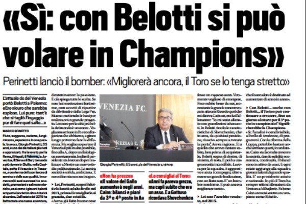 Intervistato da “Tuttosport”,l’ex direttore sportivo del Palermo, Giorgio Perinetti ha parlato di Andrea Belotti: «Aveva già fatto buone cose nell’AlbinoLeffe. Lo seguii in occasione di due raduni della rappresentativa della C e dell’Under 20. Era un po’ grezzo, ma compresi subito le sue grandi potenzialità. Quando tornai a Palermo, non ebbi dubbi a puntare su di lui. Costruimmo uno squadrone per vincere la B. Il costo di Belotti era elevato. L’AlbinoLeffe chiedeva 500 mila euro per il prestito, più 2,5 milioni per il riscatto della metà. Il loro presidente, Andreoletti, era irremovibile. Zamparini aveva dei dubbi. Ma io ero sicuro che il gioco valesse la candela. Ero certo che avremmo preso un grande attaccante. Convinsi Zamparini, ma la svolta finale la diede il giocatore stesso. Pur di venire da noi e compiere un grande salto in carriera, rinunciò a 250 mila euro di stipendio: cifra che, di conseguenza, il Palermo potè aggiungere all’offerta all’AlbinoLeffe. E così trovammo l’accordo. Quella scelta di Andrea dimostrò una volta di più quanto fosse un ragazzo sano. Veramente voglioso di emergere. Fece subito bene da noi, nonostante la grande concorrenza in attacco. Ricordo quel che mi diceva Gattuso, era lui l’allenatore: “Io mi sono allenato con grandissimi attaccanti. In Belotti rivedo le caratteristiche di Shevchenko, che in area, da qualsiasi posizione, riusciva sempre a trovare la porta”. Aveva ragione. Era quello che avevo notato subito, ben prima di acquistarlo. Belotti segna di destro, di sinistro, di testa. E poi ha una generosità incredibile. Lavora per la squadra, è aggressivo e aiuta i compagni, oltre a essere un grande finalizzatore, con un fiuto raro. E’ un bomber moderno. E può ancora migliorare tanto».