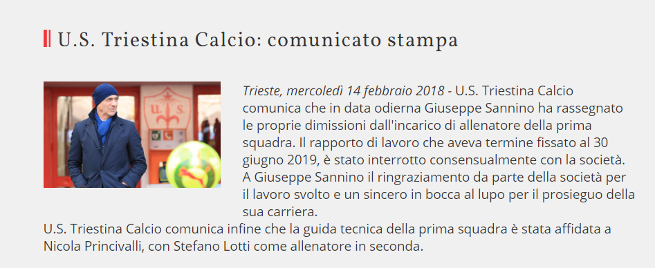 “U.S. Triestina Calcio comunica che in data odierna Giuseppe Sannino ha rassegnato le proprie dimissioni dall’incarico di allenatore della prima squadra. Il rapporto di lavoro che aveva termine fissato al 30 giugno 2019, è stato interrotto consensualmente con la società. A Giuseppe Sannino il ringraziamento da parte della società per il lavoro svolto e un sincero in bocca al lupo per il prosieguo della sua carriera.