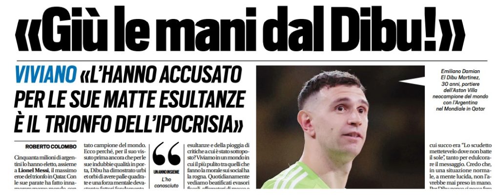 «Cosa penso delle sue esultanze e della pioggia di critiche a cui è stato sottoposto? Viviamo in un mondo in cui il più pulito tra quelli che fanno la morale sui social ha la rogna. Quotidianamente vediamo beatificati evasori fiscali, affamatori di masse e a volte è capitato pure di leggere esaltazioni di criminali. Però poi c’è la fila quando c’è da attaccare un ragazzo che, nell’euforia di un momento storico, in botta di adrenalina, si lascia andare a un’esultanza goliardica dopo essere diventato campione del mondo. Cerchiamo di essere seri. In Nba, ad esempio, prendersi per i fondelli, anche in modo pesante, è pane quotidiano di ogni atleta. Lì si insultano durante le partite, si prendono in giro sui social, sul parquet si fanno gesti per dire all’altro “sei piccolo”, “sei magro”, si fanno le linguacce dopo aver incassato una schiacciata in faccia. Tutte cose che, se accadessero nel calcio, porterebbero a gonfiarci di botte come delle zampogne! Io sono uno che normalmente evita di sfottere i rivali, a meno, però, che dietro non ci sia un validissimo motivo… Vi faccio un esempio: Massimo Ambrosini, una delle persone più competenti, calme ed equilibrate che conosco, quando il Milan vinse la Champions festeggiò sul bus tenendo, per qualche secondo, in mano uno striscione rivolto ai cugini dell’Inter il cui succo era “Lo scudetto mettetevelo dove non batte il sole”, tanto per edulcorare il messaggio. Credo che, in una situazione normale, a mente lucida, non l’avrebbe mai preso in mano. Per Dibu penso si possa fare un discorso simile: decontestualizzare è sempre sbagliato, a parer mio. Questo Mondiale è stato all’insegna di mille polemiche: dai morti sul lavoro alla corruzione fino alla condizione femminile. Ognuna di queste porcherie è stata accettata da Fifa, Nazionali, Federazioni, giocatori, tifosi. E poi, dopo tutto questo, ci si indigna per il bisht, la tunica con cui è stato vestito Messi prima di sollevare la Coppa o per l’esultanza sui generis del Dibu con il guanto sulla patta? Ma davvero facciamo? È solo ipocrisia».