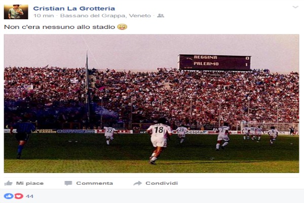 Momento amarcord per l’ex attaccante del Palermo Cristian La Grotteria, che attraverso un post pubblicato sul suo profilo Facebook ha voluto condividere un ricordo datato esattamente quindici anni fa, quando la squadra rosanero allora allenata da Bortolo Mutti pareggiò al “Granillo” contro la Reggina per 1-1. Particolarmente curioso è il nome del marcatore dei siciliani, che portò in vantaggio il Palermo all’inizio del secondo tempo: si tratta infatti di Beppe Mascara, che dei rosa diventerà poi uno storico nemico. “Non c’era nessuno allo stadio” ha scritto ironicamente La Grotteria, riferendosi all’enorme quantità di pubblico, sia casalingo che ospite, che per l’occasione aveva riempito lo stadio di Reggio Calabria nonostante si trattasse di un match di serie B. Ecco in alto la foto dell’ex calciatore e in basso un video con gli highlights dell’incontro: