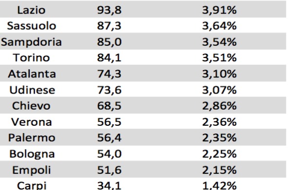 Il portale “Calcioefinanza.it” ha stilato la classifica dei ricavi dei club di serie A. Dal punto di vista dei ricavi, il fatturato è fortemente influenzato dalle big: nella scorsa stagione infatti i ricavi di Juventus, Roma, Inter e Milan hanno rappresentato il 48,4% del fatturato complessivo della massima serie. Il Palermo è al quintultimo posto con 2,35%. Ecco in basso la foto: