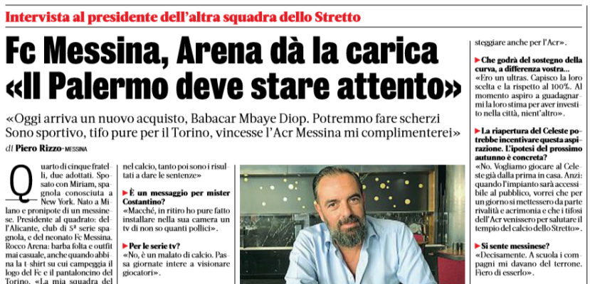 L’edizione odierna della “Gazzetta dello Sport” riporta le dichiarazioni di Rocco Arena, presidente del FC Messina e dell’Alicante, club della 5a serie spagnola. Look stravagante, tra t-shirt del FC e il pantaloncino del Torino, «La mia squadra del cuore, ora sono due». Molti tatuaggi in bella vista. quanti sono? «15 o 17, non ricordo. Quello a cui tengo particolarmente è la firma di mia madre, Maria. Quando la vedo le tocco sempre il sedere. E lei si arrabbia». Di Arena, invece, dicono si arrabbi raramente. «Non ho particolari manie di controllo. Delego conserenità. La fiducia è importante. Anche nel calcio, tanto poi sono i risultati a dare le sentenze». È un messaggioper mister Costantino? «Macché, in ritiro ho pure fatto installare nella sua camera un tv di non so quanti pollici». Per le serie tv? «No, è un malato di calcio. Passa giornate intere a visionare giocatori». Il dg Ferrante dice di aver sposato il progetto perché lei è unvincente «Lo ringrazio. In effetti, non mi piace fare la comparsa». Con il Palermo nel girone I della D, il rischio però c’è… «Dovrà vincerle tutte, in quel caso tanto di cappello. Contrariamente potrebbe esserci qualche sorpresa». Per esempio? «Il Fc Messina». Affermazione ambiziosa… «Scherzi a parte, sarà un campionato avvincente. Rispettiamo tutti, non temiamo nessuno. Non necessariamente sarà il Palermo a fare da battistrada». E se lo facesse l’Acr Messina? «Mi farebbe molto piacere se una tra Fc e Acr Messina vincesse il campionato. E’ importante che la città ritrovi il calcio professionistico. Sarei il primo a festeggiare anche per l’Acr». Che godrà del sostegno della curva, a differenza vostra… «Ero un ultras. Capisco la loro scelta e la rispetto al 100%. Al momento aspiro a guadagnarmi la loro stima per aver investito nella città, nient’altro». La riapertura del Celeste potrebbe incentivare questa aspirazione. L’ipotesi del prossimo autunno è concreta? «No. Vogliamo giocare al Celeste già dalla prima in casa. Anzi: quando l’impianto sarà accessibile al pubblico, vorrei che per un giorno si mettessero da parte rivalità e acrimonia e che i tifosi dell’Acr venissero per salutare il tempio del calcio dello Stretto». Si sente messinese? «Decisamente. A scuola i compagni mi davano del terrone. Fiero di esserlo». Antonio Montella arriva? «Credo stia per chiudere la valigia. È un grande attaccante». Il centravanti potrebbe essere Babacar Mbaye Diop… «192 centimetri. Ha giocato in Süper Lig. E’ strepitoso». Lo prendiamo per un sì? «Oggi sarà a Messina».