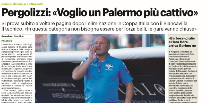 Il Palermo si appresta a tornare in campo, i rosanero domenica se la vedranno con il Roccella, anche per dimenticare lo scivolone in Coppa Italia contro il Biancavilla. Ieri Rosario Pergolizzi ha parlato nella consueta conferenza stampa pre gara, lanciando tanti spunti interessanti, l’edizione odierna del “Giornale di Sicilia” fa il punto della situazione sulle parole del tecnico.Il tecnico prima si concentra sull’eliminazione dalla Coppa: «Il Palermo deve tornare a far parte delle categorie che gli competono e per farlo bisogna vincere i campionati. La Coppa Italia in sé ha detto che la partita ha avuto i suoi numeri, che la squadra ha giocato e creato. Non ha vinto, lo accettiamo, sono contento di determinate cose e non lo sono di altre. È normale e lo sarò sempre, perché il risultato finale è quello che conta, ci teniamo tutti a raggiungere l’obiettivo e cercare di vincere questo campionato». L’obiettivo principale come rimarcato dal tecnico palermitano è sicuramente la vittoria del campionato, al momento i rosa sono a punteggio pieno con 2 vittorie contro Marsala e San Tommaso, adesso si proverà a fare bottino pieno anche contro il Roccella.«Quella di Roccella è una strada tortuosa come tutte. Noi mercoledì abbiamo finito la partita e tra gli avversari c’erano quattro o cinque giocatori con i crampi, significa che con noi danno tutto e questo mi fa piacere, vuol dire che hanno molto rispetto nei nostri confronti. Dobbiamo cercare di migliorarci e lavorare, ma non mi fa paura che gli altri debbano aspettarci. So qual è il lavoro che stiamo cercando di fare e che gli obiettivi prefissati possiamo raggiungerli solo con la continuità. Questo non significa dover vincere sempre, ci staranno anche i pareggi e le sconfitte. Se la sconfitta è data da fattori che possono migliorarci, allora può anche servire». Pergolizzi ha trovato anche cosa è mancato nel match ai suoi nel match tra Palermo e Biancavilla, per portare il risultato a casa. «Manca quel pizzico di cinismo, di cattiveria, di voglia di chiudere la partita. Spesso in questo campionato non bisogna essere belli, certe volte bisogna essere brutti e vincere le partite per 1-0, ma anche per chiudere le partite sul 4-0. Non posso e non voglio vedere una squadra che fa accademia e che si guarda allo specchio». Ricciardo è sicuramente il perno dell’attacco, giocatore praticamente insostituibile. «È il nostro terminale offensivo, quindi vede la porta e in questo momento è fondamentale. Senza di lui, probabilmente, deve cambiare la squadra come sistema di gioco. Mercoledì con Santana l’abbiamo fatto e nella ripresa, pur perdendo, ho tolto un attaccante per fare il 4-3-1-2. Non per difenderci, ma per aggiustare un po’ la coperta». Intanto ieri si è chiuso il mercato e non è arrivato un vice Ricciardo, ancora in prova il brasiliano Guilherme che dovrà convincere Pergolizzi a dargli una chance. «La società lo sta tenendo in considerazione, ma non so se sia lui il giocatore che possa servire al Palermo. A noi serve un attaccante che possa entrare nel nostro sistema di gioco. Se è uno di quelli, ben venga». Senza che questo significhi snaturare la squadra: «Se fare risultato significa giocare con otto difensori e tre attaccanti, faremo così. Viceversa, se fare risultato significa giocare con dieci attaccanti, allora giocheremo con dieci attaccanti. In questo tragitto ci saranno strade più o meno tortuose e altre più lineari, io devo però mantenere l’equilibrio sia nelle vittorie che nelle sconfitte. Per raggiungere il risultato finale serve dare equilibrio alla squadra e all’ambiente stesso». Tenendo conto anche delle condizioni dei giocatori: «Lancini e Martinelli li valuterò all’ultimo, Rizzo Pinna finché non matura sarà un giocatore come gli altri. Viene dalla Primavera ed è diversa dalla Serie D». Lo ha provato sulla propria pelle, ma in Calabria si volta pagina.Anche perché, per la prima volta, il Palermo giocherà su un campo con il manto in erba sintetica. «Ci alleniamo da tutta la settimana sul sintetico di Carini, ma di sicuro non possiamo pensare a questo».