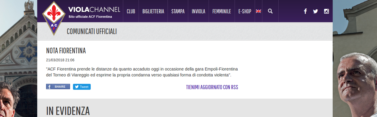 La Fiorentina ha diffuso un comunicato stampa in relazione ai fatti accaduti quest’oggi durante il match del torneo di Viareggio tra l’Empoli e la stessa società viola. Ecco quanto si legge nella nota ufficiale: “ACF Fiorentina prende le distanze da quanto accaduto oggi in occasione della gara Empoli-Fiorentina del Torneo di Viareggio ed esprime la propria condanna verso qualsiasi forma di condotta violenta“.