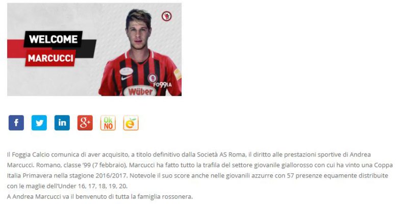 “Il Foggia Calcio comunica di aver acquisito, a titolo definitivo dalla Società AS Roma, il diritto alle prestazioni sportive di Andrea Marcucci. Romano, classe ’99 (7 febbraio), Marcucci ha fatto tutto la trafila del settore giovanile giallorosso con cui ha vinto una Coppa Italia Primavera nella stagione 2016/2017. Notevole il suo score anche nelle giovanili azzurre con 57 presenze equamente distribuite con le maglie dell’Under 16, 17, 18, 19, 20.