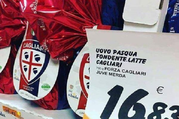 Direttamente da Cagliari arriva uno scatto che ha fatto in poche ore il giro del web. La foto in questione riporta un nuovo di Pasqua del Cagliari Calcio in vendita in un supermercato del capoluogo sardo. Tutto normale se non fosse per l’etichetta del prezzo che riporta uno slogan abbastanza curioso: “Forza Cagliari, Juve me**a!”. Di seguito il post pubblicato da “Calciatori Brutti”: