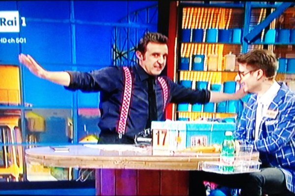 Durante l’inizio del programma TV “Affari tuoi”, Flavio Insinna nel momento dei saluti iniziali sfoggia delle bretelle rosanero, arrivatigli direttamente da Palermo da un telespettatore. In alto una foto.