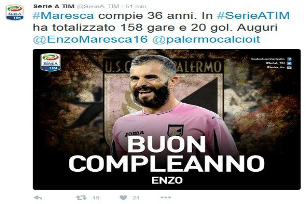 #Maresca compie 36 anni. In #SerieATIM ha totalizzato 158 gare e 20 gol. Auguri @EnzoMaresca16 @palermocalcioit pic.twitter.com/5xWrHvfblX