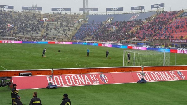 A poco più di mezz’ora dal calcio d’inizio di Bologna-Palermo, i rosanero si riscaldano sul terreno di gioco dello stadio “Dall’Ara”. In alto uno scatto.
