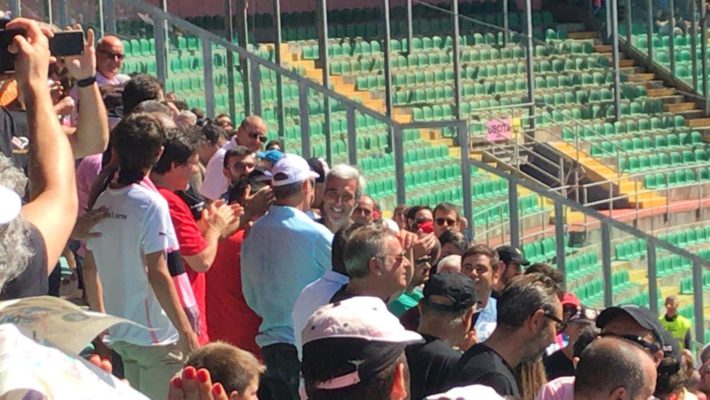 Prima gara in casa del Palermo che si trova di fronte il San Tommaso. Il presidente dei rosanero Dario Mirri, come aveva promesso, assiste alla gara dal suo posto in gradinata. In alto la foto che vede Mirri con i tifosi.