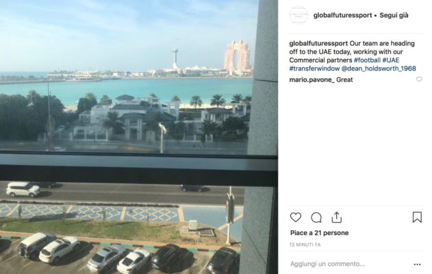 Attraverso un post pubblicato su Instagram, la Global Futures Sport ha fatto sapere di essere in viaggio verso gli Emirati Arabi per questioni lavorative. Nella didascalia della foto, nella quale è menzionato anche Dean Holdsworth, si legge infatti: “Il nostro team si sta dirigendo oggi negli Emirati Arabi Uniti, lavorando con i nostri partner commerciali”. In basso il post in questione:
