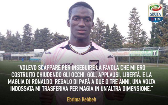 La serie A ha celebrato la storia del giovane rosanero Ebrima Kebbeh con una foto con su scritte alcune dichiarazioni del nativo del Gambia: “Volevo scappare per inseguire la favola che mi ero costruito chiudendo gli occhi: gol, applausi, libertà. E la maglia di Ronaldo, regalo di papà a 2 o 3 anni, una volta indossata mi trasferiva per maglia in un’altra dimensione”. Ecco in basso la foto: