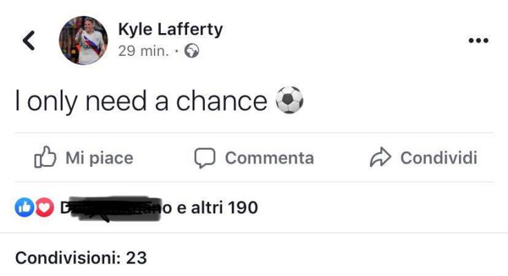 Nella giornata di ieri l’attaccante nordirlandese Kyle Lafferty, intervistato dalla nostra redazione (clicca qui), ha dichiarato che gli piacerebbe tornare in rosanero. Nella giornata odierna, su Facebook, è apparso un post firmato dall’attaccante con scritto in inglese: “Ho bisogno di una chance”. Queste poche parole dell’ex attaccante rosanero hanno fatto sognare ancora di più i tifosi del Palermo che hanno subito inondato la bacheca della pagina social di commenti. Purtroppo per loro però, secondo quanto riferito alla nostra redazione, si tratta di un profilo fake in quanto Lafferty non possiede alcun tipo di canale social.
