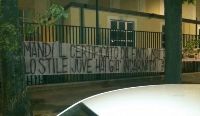 La trattativa che porterà Federico Bernardeschi a vestire la maglia della Juventus è vicina alla conclusione. Il giorno decisivo potrebbe essere lunedì. Le parti in queste ore limeranno gli ultimi dettagli. Nel frattempo il numero 10 viola non si è presentato in ritiro perché, come scritto nel certificato mandato alla società, è stato colpito da una gastroenterite acuta. I tifosi della Fiorentina non hanno preso bene questa notizia e nella notte è apparso uno striscione che recita: “Mandi il certificato da finto malato, lo stile Juve hai già incarnato”. In alto la foto dello striscione.
