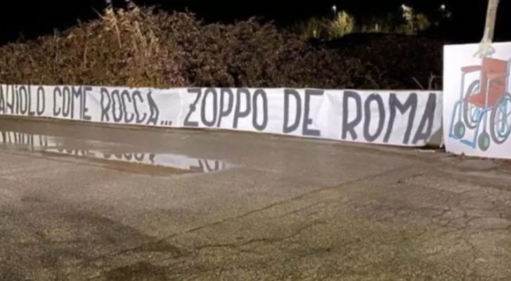 Brutto gesto alla vigilia del derby tra Roma e Lazio nei confronti di Zaniolo, giovane centrocampista giallorosso costretto ad un lungo stop dopo la rottura del crociato subita nella sfida contro la Juve. Uno striscione affisso a Trigoria recita così: “Zaniolo come Rocca…Zoppo de Roma”. In alto la foto dello striscione di cattivo gusto esposto nella notte fuori da Trigoria accompagnato dall’immagine di una carrozzina.