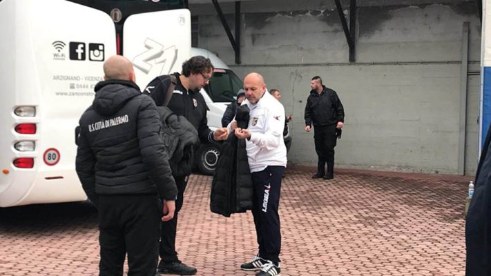 Bruno Tedino ha appena lasciato lo stadio “Piola”. Il mister rosanero, che durante Novara-Palermo è stato colpito all’orecchio da un oggetto lanciato dalla tribuna, non è intervenuto in sala stampa al termine del match. In alto una foto scattata dalla nostra redazione, che mostra il tecnico mentre lascia l’impianto piemontese. La squadra, invece, è rimasta al “Silvio Piola” in attesa di dirigersi all’aeroporto per fare rientro a Palermo.
