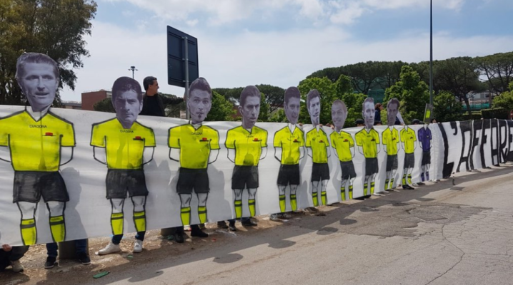 E’ forte la protesta dei tifosi del Napoli fuori dallo stadio San Paolo prima della sfida contro il Torino. Il corteo pacifico ha esposto anche uno striscione che raffigura alcuni arbitri del campionato italiano e che prosegue con la frase: “Stagione 2018-19: a parametro zero sono gli arbitri l’affare vero“. In alto la foto in questione.