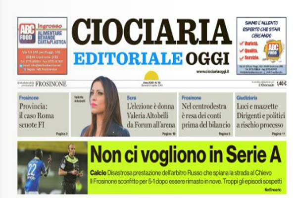 Scoppia la polemica dopo la disfatta del Frosinone, che ieri sera è crollato per 5-1 sotto i colpi del Chievo a Verona. I ciociari hanno anche chiuso il match in nove uomini a causa di due espulsioni l’edizione odierna del quotidiano “Ciociaria Oggi” titola in maniera eloquente: “Non ci vogliono in serie A”. Il giornale frusinate giudice disastroso l’arbitraggio della gara del “Bentegodi”.