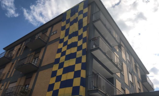 In attesa di Frosinone-Foggia, match che potrebbe essere decisivo per il futuro della squadra ciociara, sono moltissime le bandiere giallazzurre esposte dai tifosi all’esterno delle proprie abitazioni. Le vie della città, infatti, sono piene dei colori della squadra guidata da Longo. In alto una foto in questione.
