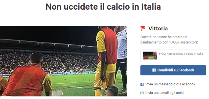 Frosinone-Palermo è ormai sulla bocca di tutti. Dai diretti interessati, le due società, fino ai tifosi, passando anche per la politica. Molti appassionati di calcio, dopo aver visto il match, hanno però deciso che era davvero inaccettabile quanto visto nella finale di ritorno dei play off di serie B. Motivo per il quale hanno lanciato la petizione “Non uccidete il calcio in Italia”, di cui riportiamo il testo di seguito: “Quello che il mondo calcistico ha assistito durante la finalissima play off tra Frosinone-Palermo è qualcosa di veramente raccapricciante. Giudice di gara intimidito dai giocatori ciociari per un rigore in favore del Palermo,….prima non dato, poi convalidato…. e successivamente negato, ma cosa ancora più grave il lancio di extra palloni da parte dei tifosi e dei tesserati della squadra di casa per interrompere il normale svolgimento della partita… partita in quel momento ferma sul risultato di 1-0. Inoltre l’arbitro non ha mai fischiato il termine di tale gara, per via di una invasione di campo. Il calcio è stato sempre definito come “lo sport più bello del mondo” perché gode di regole ben precise…Tutti i tifosi di questo bellissimo sport (e non solo quelli palermitani, che hanno subito questa ingiustizia sportiva) sono indignati e chiedono a gran voce l’uso del regolamento e la messa in pratica delle sanzioni previste da tali comportamenti (sconfitta a tavolino di 0-3 per la squadra che tramite personali azioni non consente il normale svolgimento dell’incontro). Non uccideteci il nostro sport, non uccidete il calcio. Sanzionate il Frosinone calcio applicando le regole“. Lanciata appena 24 ore fa, la petizione ha già raggiunto le 10 mila firme, come si evince dalla foto in alto.