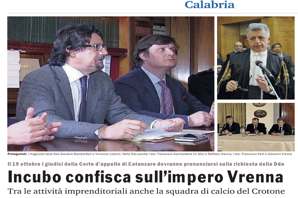 confronti dei due imprenditori crotonesi che sono anche proprietari e azionisti del Crotone Calcio. Nell’udienza di ieri gli avvocati Francesco Verri e Francesco Gambardella che difendono i fratelli Vrenna e le loro società, hanno chiesto che venga dichiarato inammissibile l’appello della Procura perché il ricorso contro il rigetto della richiesta di confisca non è accompagnato da nessuna motivazione. Da parte sua la Procura generale rappresentata in Appello dal sostituto procuratore Salvatore Curcio, ha depositato altre dichiarazioni rese negli anni scorsi da alcuni collaboratori di giustizia e un supplemento di relazione della Guardia di Finanza. I giudici della Corte d’Appello si sono riservati la decisione sulla richiesta di inammissibilità del ricorso avanzata dalle difese. Che a loro volta si sono riservati di controdedurre rispetto agli atti prodotti ieri dalla Procura generale. Nel novembre del 2015 la Direzione distrettuale antimafia di Catanzaro aveva chiesto al Tribunale di Crotone la misura della confisca e della sorveglianza speciale per Raffaele e Gianni Vrenna sul presupposto che il gruppo Vrenna fosse contiguo alle cosche mafiose del crotonese. A sostegno della sua richiesta la Procura antimafia aveva portato le dichiarazioni rese negli anni scorsi da alcuni collaboratori di giustizia, dall’ex boss Pino Vrenna a Luigi Bonaventura passando per Vincenzo Marino i quali sostenevano che gliimprenditori avessero pagato la cosca mafiosa crotonese per essere tenuti al riparo da attentati e danneggiamenti. Ma il Tribunale invece, dando ragione alle difese, con decreto depositato il 14 gennaio, aveva stabilito che non c’erano i presupposti per la confisca dei beni e che i fratelli Vrenna sono del tutto estranei alle vicende della criminalità organizzata crotonese. «Il Collegio ritiene — scrissero i giudici del Tribunale di Crotone in un passo del provvedimento — che la proposta debba essere rigettata sia con riferimento alla misura reale (confisca) sia con riferimento a quella personale (sorveglianza speciale di pubblica sicurezza) difettando, per entrambi i proposti, elementi di pericolosità sociale riconducibili alla categorie soggettive previste dall’art. 4 del Codice antimafia». Una decisione appellata dalla Dda che nel ricorso firmato dai procuratori aggiunti Giovanni Bombardieri e Vincenzo Luberto e dal pm Domenico Guarascio, defini «non condivisibile e ingiustificabile» la decisione del Tribunale il quale secondo i magistrati della Dda avrebbero svilito le dichiarazioni di alcuni collaboratori, finendo per emettere un decreto inerente le misure di prevenzione «che anziché concentrarsi sui dati e sugli elementi indiziari globalmente intesi ai fini della ricostruzione del giudizio di pericolosità sociale, ricerca arbitrariamente motivazioni inerenti l’inattendibilità dei dati offerti nella proposta, sulla base di ricostruzioni non controllate ed arbitrarie»”. Questo quanto si legge sull’edizione odierna de “La Gazzetta del Sud”.