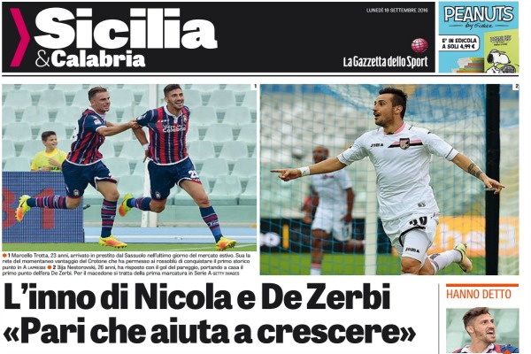 “Il pareggio dell’Adriatico è un punto di ripartenza per Crotone e Palermo. Non solo perché i calabresi hanno finalmente spazzato via lo zero dalla classifica e i siciliani hanno incassato il primo punto della gestione De Zerbi. La sfida ha dato molte indicazioni ai tecnici. Così Davide Nicola sintetizza la prova del Crotone: «Stiamo crescendo, e potevamo vincere, ma è importante avere fornito una buona prova – considera il tecnico ­. Siamo stati aggressivi: nel primo tempo ma anche nel finale di partita potevamo segnare altre reti. Il Palermo è venuto fuori nei primi 25 minuti della ripresa col suo palleggio, perché doveva cercare il pareggio, arrivato poi anche per nostri errori». Lo stop di Tonev ha influito sulla formazione. «Ha preso una botta al ginocchio nella rifinitura. Così, si è fermato per la terza volta dall’inizio del campionato. Per il suo ruolo di esterno ci serviva tanto…». Non invoca l’alibi delle gare interne lontano da Crotone. «I punti vanno presi sia in casa sia in trasferta. Per ora il nostro stadio è a Pescara. Quando lo Scida sarà pronto, tornerà ad essere importantissimo per il sostegno che lì sanno darci i nostri tifosi». L’ESORDIENTE È soddisfatto Roberto De Zerbi nel giorno del debutto su una panchina di A (col Napoli era squalificato). Per l’occasione ha derogato alle sue abitudini: niente tuta, in campo con la giacca della divisa sociale, salvo poi liberarsene appena la gara è entrata nel vivo. «Abbiamo fatto delle cose buone ­ dichiara il tecnico subentrato a Ballardini ­, ma c’è da lavorare ancora tantissimo. In fondo, sono a Palermo dall’altra settimana e solo da pochi giorni ho potuto allenare tutto il gruppo. E ora ci attendono tre partite in una settimana, quindi potremo allenarci poco…». Individua gli aspetti da far migliorare per vedere al più presto il suo Palermo. «Bisogna lavorare sul piano psicologico. In campo, dobbiamo avere maggiore convinzione. Soprattutto, bisogna imparare ad osare e comunque ad avere coraggio». Il primo gol in A del macedone Nestorovski porta una buona notizia anche in prospettiva. Per risalire la classifica serve l’apporto di un bomber. «Nestorovski può essere fondamentale per noi a patto che venga servito bene dai compagni e lui si renda utile al gioco della squadra». PIENO DI FIDUCIA Sguardi protesi in avanti anche da parte di chi è sceso in campo. Marcello Trotta ha segnato il suo primo gol col Crotone, ma sottolinea il risultato. «Il pareggio? Per noi è un bicchiere mezzo pieno, non certo vuoto. E’ innegabile che nel primo tempo potevamo chiudere la partita e nella ripresa forse siamo arretrati troppo…». Leonardo Capezzi aggiunge qualcosa di suo alla tesi del compagno: «C’è un po’ di rammarico per non aver centrato la vittoria, però è arrivato il primo punto che ci dà un po’ di entusiasmo. Con la Roma? Non partiamo battuti…». Andrea Rispoli conclude: «Risultato giusto. Siamo cresciuti rispetto alla partita col Napoli. Con De Zerbi ci siamo trovati subito bene». Il Crotone si è trasferito a Roma, alla Borghesiana per preparare la sfida con la squadra di Spalletti. Il Palermo ha raggiunto Coccaglio, vicino Brescia, in attesa della trasferta con l’Atalanta. Il difensore Rajkovic che, in occasione del gol del Crotone, ha riportato una frattura pluriframmentaria del setto nasale, stamani sarà operato a Milano”. Questo quanto si legge sull’edizione odizione odierna de “La Gazzetta dello Sport”.