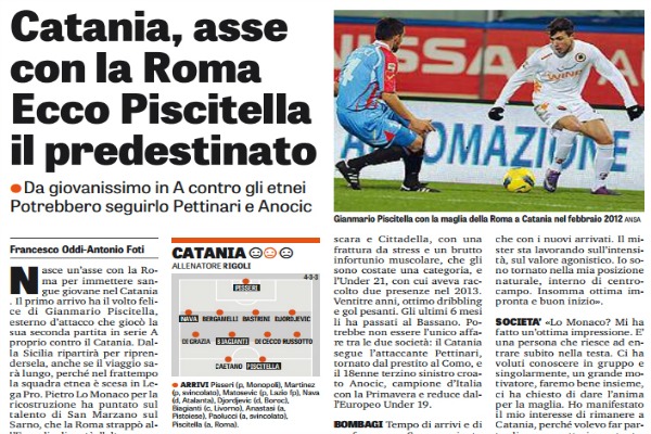 “Nasce un’asse con la Roma per immettere sangue giovane nel Catania . Il primo arrivo ha il volto felice di Gianmario Piscitella, esterno d’attacco che giocò la sua seconda partita in serie A proprio contro il Catania. Dalla Sicilia ripartirà per riprendersela, anche se il viaggio sarà lungo, perché nel frattempo la squadra etnea è scesa in Lega Pro. Pietro Lo Monaco per la ricostruzione ha puntato sul talento di San Marzano sul Sarno, che la Roma strappò all’Empoli: diventò l’alterego – spesso su fascia opposta di Gianluca Caprari, nel gruppo dei ’93 che vinse in due anni lo scudetto Allievi e quello Primavera, con Florenzi capitano.
