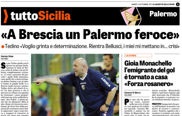 Gazzetta dello Sport: “«A Brescia un Palermo feroce». Tedino: «Voglio grinta e determinazione. Rientra Bellusci, i miei mi mettano in… crisi»”