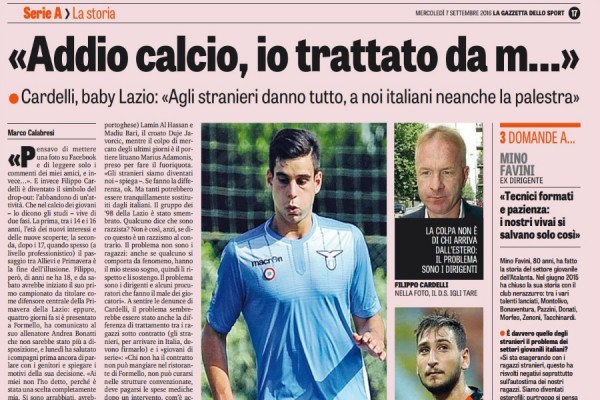 Gazzetta dello Sport: “«Addio calcio, io trattato da m…». Cardelli, baby Lazio: «Agli stranieri danno tutto, a noi italiani neanche la palestra»”