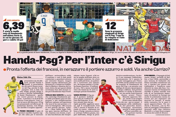 “Aprescindere da chi allenerà: perché Handa è Handa. A prescindere da chi sarà il futuro tecnico del Psg, perché il club parigino non si fida del solo Trapp, perché Sirigu è in uscita e perché l’affidabilità di Samir Handanovic quello che vorrei giocare in Champions è provata e va al di là del piacere o non piacere. Così, eccoci al succo del discorso: il Psg sta preparando un’offerta per il portierone sloveno. Con Sirigu che farebbe il tragitto opposto. IL PRIMO INCASSO Il giro di portieri sarebbe il primo tappo che salta per il mercato dell’Inter: arriverebbero soldi, il sostituto e così il club potrà cominciare a guardarsi attorno per investire denaro, magari dando seguito all’interesse per Bentancur o Candreva/Gabbiadini (o Marlos e Almiron del Lanus), detto che per questi ultimi serviranno ben altri incassi come per il desiderato Yaya Touré. VOGLIA MAI GODUTA La storia che coinvolge Handanovic parte dalla penultima gara di campionato o più semplicemente dall’aver sposato un’esperienza che non lo ha mai portato a vivere la Champions. «Mi scoccia sì non poterla giocare, vedremo…» disse Samir dopo l’ultima gara interna dell’Inter. Al che, insieme con Jovetic, si prese una bacchettata dal vicepresidente Javier Zanetti: «Chi veste la maglia dell’Inter deve essere sempre contento. Se a loro non andrà più bene, ne parleremo e troveremo una soluzione». Ne hanno parlato e il club ha fissato il prezzo: 15 milioni di euro. Più o meno trattabili visto che Samir ha 31 anni comunque portati benissimo. VARIE IPOTESI Il Psg pagò il portiere italiano poco più di 4 milioni di euro dal Palermo: il valore attuale fatto dai parigini potrebbe aggirarsi attorno agli 8 considerando l’età (29) e ancora il biennio di accordo in essere. «Salvatore sta bene a Parigi, tuttavia se dovesse arrivare l’offerta giusta, magari dall’Italia, Sirigu la prenderà in considerazione», ha detto il suo manager Pallavicino. Tecnicamente, ed è questa la via più vantaggiosa per l’Inter, potrebbe anche andare in scena un acquisto di Handanovic da parte del Psg e un prestito con obbligo di riscatto (posticipato) di Sirigu a Milano. Sul portiere italiano c’è anche la Fiorentina, ma anche fonti francesi danno avanti l’Inter. Mancini apprezza Sirigu, anche se ha sempre avuto come chiodo fisso Perin che ora pur se avanti è impegnato nella riabilitazione del ginocchio destro. Comunque attenzione, perché il nodoportieri all’Inter potrebbe anche portare Carrizo a Palermo. E POI BROZO… L’ingaggio di Salvatore Sirigu, secondo di Buffon a Euro 2016, porterebbe a una ventata di italianità che l’Inter vorrebbe considerare via via: è (anche) per questo che Gabbiadini o Candreva sono obiettivi in cima alla lista. Certamente l’uscita di Handanovic sarebbe il primo tassello non solo di un movimento importante di portieri in Europa ma anche la primissima mossa interista per poi ragionare sul mercato in entrata. Il tavolo della trattativa fra le parti è quasi apparecchiato. Poi toccherà a Brozovic, con la Premier in vantaggio (Tottenham e Arsenal) sulla Liga (Atletico Madrid); e a Juan Jesus sempre in attesa dei soldi di Alvarez”. Questo quanto si legge sull’edizione odierna de “La Gazzetta dello Sport”.
