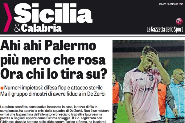 Gazzetta dello Sport: «Ahi ahi Palermo più nero che rosa. Numeri impietosi: difesa flop e attacco sterile. Ora chi lo tira su?”