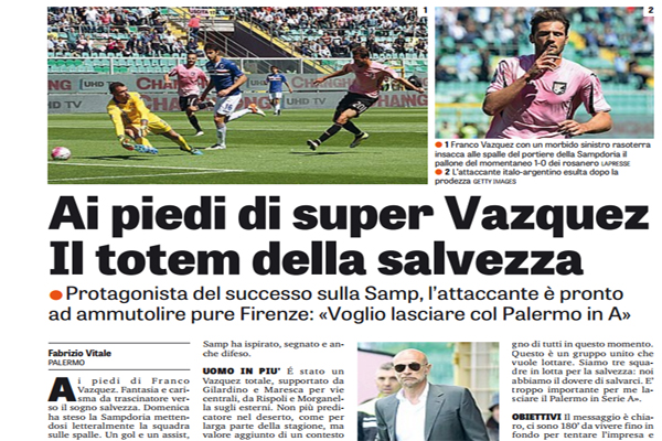 Gazzetta dello Sport : “Ai piedi di super Vazquez, il totem della salvezza. Protagonista del successo sulla Samp, è pronto ad ammutolire Firenze: «Voglio lasciare col Palermo in A»”