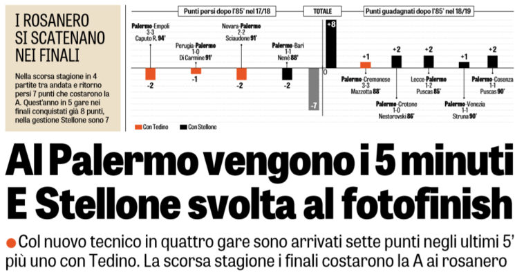 “Da zona fatale a zona letale”. Questo l’incipit dell’odierna edizione de “La Gazzetta dello Sport”, che approfondisce l’analisi sui gol decisivi messi a segno dai rosanero nei minuti finali, al contrario di quanto avveniva fino a poco tempo fa. Di seguito un estratto: “Infatti hanno bruciato la promozione diretta nei finali di quattro partite: una nel girone d’andata, Palermo-Empoli 33 con rigore di Caputo al 94′, tre in quello di ritorno, Perugia-Palermo 0-1 con gol di Di Carmine al 91′, Novara-Palermo 22 con gol di Sciaudone al 91’ e Palermo-Bari 11 con gol di Nené al’88’. Ben tre vantaggi svaniti“. Quest’anno invece la situazione è decisamente cambiata. Ecco come prosegue “La Gazzetta dello Sport”: “E’ avvenuto con il Crotone, con il gol di Nestorovski al 86’, contro il Lecce con la rete di Puscas al 85’, contro il Venezia grazie al gol di Struna al 90’ e contro il Cosenza ancora con Puscas al 90’. Tre volte da posizione di pareggio e una di svantaggio. Se aggiungiamo anche il punto conquistato sui titoli di coda con il gol di Mazzotta con la Cremonese, ancora con Tedino in panchina, i punti fatti al fotofinish diventano 8 […] Negli ultimi anni non è accaduto spesso di vedere il Palermo vincere o pareggiare al ridosso del 90’. L’ultimo a segnare sui titoli di coda era stato Trajkovski nella stagione 2016/17 in Serie A a Marassi contro il Genoa per il 3-4 definitivo. Sempre in quel campionato ci era riuscito anche Nestorovski con un gol a Bergamo contro l’Atalanta all’89’ che premise ai rosanero di vincere 1-0. Andando alla stagione precedente ci furono altre due occasioni:El Kaoutari all’92’ contro il Genoa per 1-0 finale, e Djurdjevic al 88’ per il 2-2 a Carpi. Di sicuro non si è mai arrivati a toccare la quota di quattro gol a stagione negli ultimi cinque minuti […]”.
