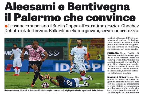 Gazzetta dello Sport: “Aleesami e Bentivegna, il Palermo che convince. I rosanero superano il Bari in Coppa all’extratime grazie a Chochev. Debutto ok del terzino”