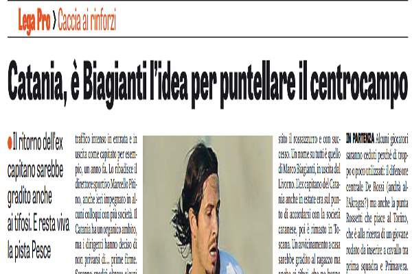 “Due settimane di indagini, colloqui, trattative, contatti, abboccamenti. Poi il Catania deciderà chi aggiungere in organico e chi cedere. Operazioni non semplici, ma quanto meno non ci sarà un traffico intenso in entrata e in uscita come capitato per esempio, un anno fa. Lo ribadisce il direttore sportivo Marcello Pitino, anche ieri impegnato in alcuni colloqui con più società. Il Catania ha un organico ambito, ma i dirigenti hanno deciso di non privarsi di… prime firme. Saranno spediti altrove alcuni giovani e chi ha giocato di meno. A patto che si trovino sostituti che possano elevare il tasso tecnico dell’intero organico. RITORNI DI FIAMMA Il reparto da rafforzare maggiormente è il centrocampo. E il Catania sta anche valutando due ipotesi molto suggestive. Riguardano due giocatori che hanno già vestito il rossazzurro e con successo. Un nome su tutti è quello di Marco Biagianti, in uscita dal Livorno. L’ex capitano del Catania anche in estate era sul punto di accordarsi con la società catanese, poi è rimasto in Toscana. Un avvicinamento a casa sarebbe gradito al ragazzo ma anche ai tifosi, che ne hanno sempre stimato l’impegno e il carattere forte. Altra ipotesi è sempre legata a Simone Pesce, ex capitano del Novara promosso in B, in questa stagione meno utilizzato e considerato, a sua volta, sul mercato. Pesce è un altro beniamino dei tifosi per avere segnato un gol nel derby col Palermo, in casa, nell’aprile del 2011. IN PARTENZA Alcuni giocatori saranno ceduti perché di troppo o poco utilizzati: il difensore centrale De Rossi (andrà all’Akragas?) ma anche la punta Rossetti che piace al Torino, che è alla ricerca di un giovane rodato da inserire a cavallo tra prima squadra e Primavera. Rossetti ha anche giocato in Serie B e segnato, nella scorsa stagione, un gol al Bari, ma in Lega Pro ha trovato meno spazio, chiuso da Russotto, Falcone e Calderini. Potrebbero andare via anche i mediani Lulli e Russo, oltre che il giovane attaccante Di Grazia, quest’ultimo accostato a Melfi e Akragas”. Questo quanto si legge oggi su “La Gazzetta dell9o Sport”.
