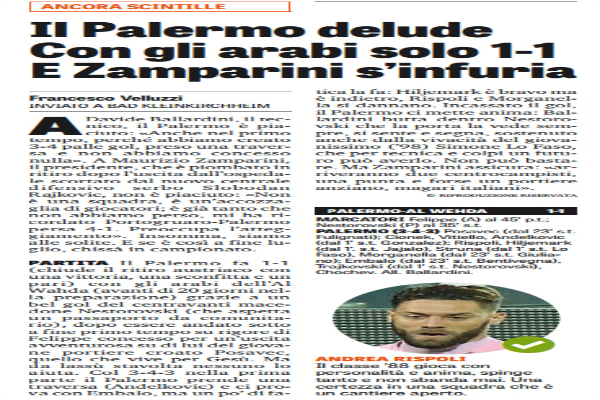 PARTITA Il Palermo fa 1-1 (chiude il ritiro austriaco con una vittoria, una sconfitta e un pari) con gli arabi dell’Al Wehda (avanti di 20 giorni nella preparazione) grazie a un bel gol del centravanti macedone Nestorovski (che aspetta un passaporto da comunitario), dopo essere andato sotto a fine primo tempo su rigore di Felippe concesso per un’uscita avventurosa su di lui del giovane portiere croato Posavec, quello che vive per Gesù. Ma da lassù stavolta nessuno lo aiuta. Col 3-4-3 nella prima parte il Palermo prende una traversa (Andelkovic) e ci prova con Embalo, ma un po’ di fatica la fa: Hiljemark è bravo ma è indietro, Rispoli e Morganella si dannano. Incassato il gol, il Palermo ci mette anima: Ballardini butta dentro Nestorovski che la porta la vede sempre, si sente e segna, sostenuto anche dalla vivacità del giovanissimo (’98) Simone Lo Faso, che per tecnica e colpi un futuro può averlo. Non può bastare. Ma Zamparini assicura: «arriveranno due centrocampisti, una punta e forse un portiere anziano, magari italiani»”. Questo ciò che si legge sull’edizione odierna de “La Gazzetta dello Sport”.