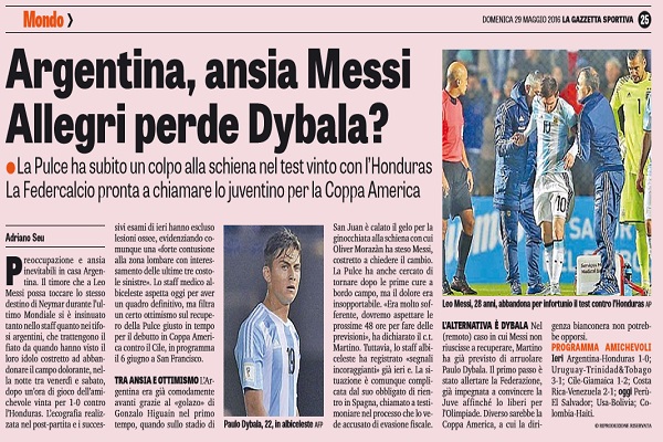 “Preoccupazione e ansia inevitabili in casa Argentina. Il timore che a Leo Messi possa toccare lo stesso destino di Neymar durante l’ultimo Mondiale si è insinuato tanto nello staff quanto nei tifosi argentini, che trattengono il fiato da quando hanno visto il loro idolo costretto ad abbandonare il campo dolorante, nella notte tra venerdì e sabato, dopo un’ora di gioco dell’amichevole vinta per 10 contro l’Honduras. L’ecografia realizzata nel postpartita e i successivi esami di ieri hanno escluso lesioni ossee, evidenziando comunque una «forte contusione alla zona lombare con interessamento delle ultime tre costole sinistre». Lo staff medico albiceleste aspetta oggi per aver un quadro definitivo, ma filtra un certo ottimismo sul recupero della Pulce giusto in tempo per il debutto in Coppa America contro il Cile, in programma il 6 giugno a San Francisco. TRA ANSIA E OTTIMISMO L’Argentina era già comodamente avanti grazie al «golazo» di Gonzalo Higuain nel primo tempo, quando sullo stadio di San Juan è calato il gelo per la ginocchiata alla schiena con cui Oliver Morazàn ha steso Messi, costretto a chiedere il cambio. La Pulce ha anche cercato di tornare dopo le prime cure a bordo campo, ma il dolore era insopportabile. «Era molto sofferente, dovremo aspettare le prossime 48 ore per fare delle previsioni», ha dichiarato il c.t. Martino. Tuttavia, lo staff albiceleste ha registrato «segnali incoraggianti» già ieri e. La situazione è comunque complicata dal suo obbligato di rientro in Spagna, chiamato a testimoniare nel processo che lo vede accusato di evasione fiscale. L’ALTERNATIVA È DYBALA Nel (remoto) caso in cui Messi non riuscisse a recuperare, Martino ha già previsto di arruolare Paulo Dybala. Il primo passo è stato allertare la Federazione, già impegnata a convincere la Juve affinché lo liberi per l’Olimpiade. Diverso sarebbe la Coppa America, a cui la dirigenza bianconera non potrebbe opporsi”. Questo quanto si legge sull’edizione odierna de “La Gazzetta dello Sport”.