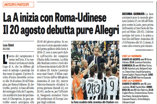 “L’ avvio del campionato è ormai nell’aria. E la conferma è arrivata ieri dalla Lega di A, che ha diffuso gli orari di anticipi e posticipi dei due turni di agosto. Il primo fischio d’inizio dovrebbe arrivare alle 18 di sabato 20 all’Olimpico, per Roma-Udinese. Sì, dovrebbe, perché, in base all’esito del sorteggio Uefa del 5 agosto, che stabilirà le date dei preliminari di Champions, la gara potrebbe essere anticipata alle 20.45 del giorno prima. Se ancora non è certo quando rotolerà il primo pallone della Serie A 2016-17, non ci sono però dubbi sull’esordio dei campioni d’Italia della Juventus. La sfida allo Stadium contro i rivali della Fiorentina inizierà alle 20.45 di sabato 20. Anche i posticipi sono stati fissati: il Milan ospiterà il Torino dell’ex Mihajlovic domenica 21 (ore 18), mentre Palermo-Sassuolo chiuderà la prima giornata (lunedì 22, ore 20.45), anche se, per l’ufficialità, bisognerà attendere l’esito del preliminare di Europa League degli emiliani.