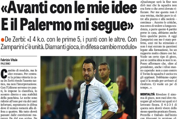 Gazzetta dello Sport: “«Avanti con le mie idee e il Palermo mi segue». De Zerbi: «I 4 k.o. con le prime 5, i punti con le altre. Con Zamparini c’è unità. Diamanti gioca, in difesa cambio modulo»”