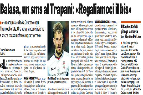 Gazzetta dello Sport: “Balasa, un sms al Trapani: «Regaliamoci il bis. Ho conquistato la A a Crotone, e qui l’hanno sfiorata. Ora serve vincere insieme e so che possiamo fare un gran torneo»”