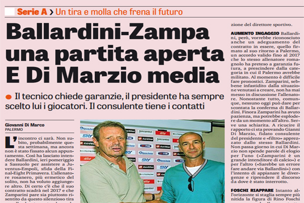 Gazzetta dello Sport: “Ballardini-Zampa una partita aperta e Di Marzio media. Il tecnico chiede garanzie, il presidente ha sempre scelto lui i giocatori. Il consulente tiene i contatti”