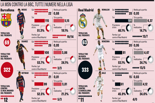 “D’accordo, in classifica ci sono 10 punti di distacco. Cosa che toglie caffeina a questo Clasico. Però non si può restare indifferenti di fronte a una partita nella quale si sfidano i due migliori tridenti del calcio mondiale, con uno dei due, quello blaugrana, che corre senza timore di dirlo per diventare il miglior trio offensivo della storia del calcio. SPETTACOLO PER JOHANN Lo spirito edonistico di Johann Cruijff, evocato prima dal grande mosaico che si disegnerà sulle tribune del Camp Nou e poi dall’applauso al minuto 14’, sarà chiamato a giudicare la grande sfida tra MessiSuarezNeymar e BaleBenzemaCristiano. MSN vs BBC. I primi hanno segnato 107 gol nelle 51 partite stagionali e 69 nelle 30 giornate di Liga. I rivali 80 (in 39 partite) e 63. In Liga dopo Barça e Madrid il miglior attacco è quello dell’Athletic: i baschi tutti insieme hanno fatto 48 reti. L’Atletico del ‘Cholo’, secondo in Liga, 46. Questo per dare un’idea della mostruosità delle cifre dei nostri 6 uomini d’oro. MILIONI, GOL E ASSIST Gente che è costata decine di milioni, i 100 di Bale, i 96 di Ronaldo, l’altissimo prezzo ‘X’ di Neymar che i giudici che stanno indagando sulla finanza creativa delle parti coinvolte nello sbarco del brasiliano in Catalogna ritengono sia anch’esso vicino o addirittura superiore alle 3 cifre, gli 82 di Suarez. Palate di soldi in cambio di palate di gol e assist. I tre del Barça che si vogliono bene e si cercano anche fuori dal campo, i 3 del Madrid che s’ignorano: «Ma io non ho bisogno di bacini e abbraccetti o di inviti a cena a casa mia per giocare bene con i compagni, ciò che importa veramente è la sintonia in campo», ha detto secco Ronaldo poco tempo fa. E anche quella in teoria è migliorabile, perché i numeri dicono che il portoghese tira tantissimo e non sempre a proposito. LA BOTTA I cannibali del gol domani sera si giocano onore e orgoglio, ma anche il Pichichi e la Scarpa d’Oro (col permesso di Higuain e Jonas del Benfica). All’andata non c’era Messi, lungodegente: entrò nella ripresa senza trovare la rete per il quarto Clasico consecutivo, lui che è il pichichi della sfida, con 21 reti in 31 partite (Ronaldo è a 15 in 27 sfide). La BBC sì che c’era al completo, e fu desintonizzata dal 40 dei catalani con doppietta di Suarez e reti di Neymar e Iniesta. Botta al morale della truppa e alla reputazione di Benitez. STILI DIVERSI I tre cavalieri bianchi amano gli spazi, la corsa e il contropiede fulminante. Se devono far gol manovrando dipendono in maniera evidente da Benzema, la pedina di scambio che permette ai due armadi che gli stanno a fianco d’inserirsi aprendo le terrificanti ante. I sudamericani amano la palla, e basta. Segnano in ogni modo: col dialogo stretto, in velocità, col lancio lungo (l’apertura diagonale di Messi per Neymar è già un classico del Barça di Luis Enrique), sfruttando alternativamente la potenza di Suarez e i dribbling di Messi e Neymar. I numeri complessivi della MSN sono migliori perché il Barça tra le varie coppe e Supercoppe ha giocato addirittura 12 partite in più del Madrid e perché Bale ha giocato (bene) a intermittenza: muscoli fragili e cure inadeguate gli hanno permesso di essere presente più o meno solo nella metà delle partite, mentre Ronaldo non è mai mancato. Il Barça grazie a Neymar e Suarez ha resistito ai due mesi di assenza di Messi in maniera quasi indolore. OBIETTIVI PERSONALI Messi cerca il gol numero 500 tra Barcellona e Argentina, Bale la prima rete in Liga al Barcellona, ricordandosi del magico gol nella finale di Copa del Rey di due anni fa con la corsa oltre la linea laterale per bruciare il povero Bartra. Benzema la prima rete in campionato al Camp Nou, al settimo anno di tentativi. Tutti vogliono la gloria, che in Clasico paga doppio”. Questo quanto riportato dall’edizione odierna de “La Gazzetta dello Sport”.