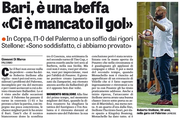 Gazzetta dello Sport: “Bari, è una beffa: «Ci è mancato il gol». In Coppa, l’1-0 del Palermo a un soffio dai rigori. Stellone: «Sono soddisfatto, ci abbiamo provato»”