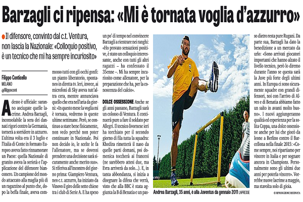 Gazzetta dello Sport: “Barzagli ci ripensa: «Mi è tornata voglia d’azzurro»”