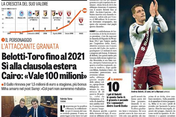 “L’amarezza per la sconfitta a Marassi; la soddisfazione per il rinnovo del nuovo simbolo granata. È stato un pomeriggio a due facce ieri per Urbano Cairo: appena finita la partita, il presidente è rientrato di corsa a Torino per ritirare il premio «Torinese dell’anno 2016» assegnatogli dal quotidiano locale Cronaca Qui e ha approfittato dell’occasione perannunciare ciò che nel mondo granata era già trapelato da settimane. «Sono lieto di dirvi che abbiamo rinnovato il contratto con il nostro Belotti fino al 2021 – ha detto il patron –. Abbiamo inserito una clausola rescissoria, valida solo per l’estero, di 100 milioni. Se lo vorranno dovranno strapagarlo, ma spero che nessuno mai paghi questa clausola». DERBY La soddisfazione di Cairo avvicina al derby di domenica prossima: c’era da superare la clausola di Higuain da 90 milioni (94,7 per l’estero quella per l’argentino della Juve), obiettivo ottenuto con il nuovo accordo del Gallo che andrà a guadagnare 1,5 milioni di euro a stagione più bonus. Il rinnovo di Belotti, ora quindi molto più lontano dalle sirene inglesi (anche Mourinho si era fatto sotto), stempera l’amarezza per la quarta sconfitta stagionale, ancora in trasferta, dopo quelle con Milan, Atalanta e Inter. «Se avessimo pareggiato non avremmo rubato nulla, abbiamo giocato meglio delle ultime volte», spiega Sinisa Mihajlovic. «Veniamo da una striscia di 20 punti in 10 partite, roba da Champions, a livello di classifica non cambia molto, il campionato è ancora lungo. Mi dispiace perché, a partire dalla traversa di Iago, di occasioni ne abbiamo avute ma ci è mancata la cattiveria». Il serbo la prende quasi con filosofia, pur mantenendo alta la concentrazione. Non accetta, Miha, la definizione di un Toro che lotta e basta: «Abbiamo solidi principi di gioco, oltre a quelli morali che fanno parte del Dna granata. Quando li seguiamo entrambi allora giochiamo bene e vinciamo». Ed ecco perché contro la Juve non servirà solo una partita «da maschi», come la definisce il tecnico serbo, ma anche «giocata come si deve». Caricare la partita? In questo caso non serve: «Ci sono sfide in cui gli stimoli vengono da sé, se un giocatore ha bisogno di essere caricato prima di un derby, deve cambiare mestiere». Sulla possibilità di annullare il ritiro prepartita, Miha ci va con i piedi di piombo pur lasciando la porta aperta: «Non ho una regola, dipende dal gruppo, dipende da come vedrò la squadra». Il riferimento è a quanto accaduto nel febbraio 2014 quando alla Samp lasciò liberi i giocatori prima della sfida al Genoa. Quella volta portò bene: i blucerchiati vinsero 10. E il gol decisivo fu di Maxi Lopez.”. Questo quanto si legge su “La Gazzetta dello Sport”.