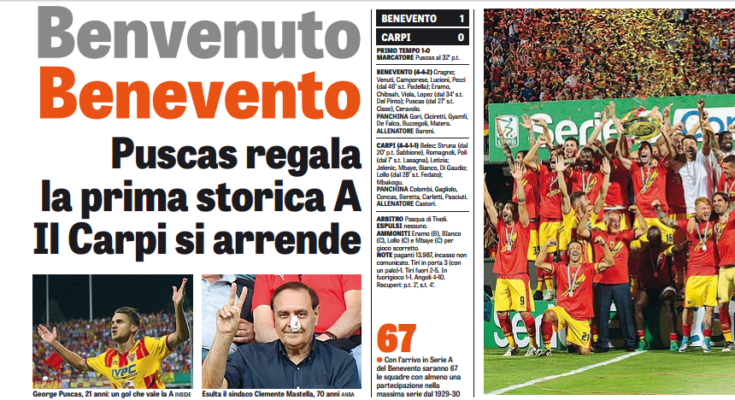 IL PROTAGONISTA Se c’è un posto al mondo in cui è più famoso George Puscas di Ferenc Puskas questo è Benevento. Perché il gol della Serie A è stato dell’attaccante rumeno di scuola Inter, capace di oscurare il mito del quasi omonimo ungherese. E di spegnere le speranza del Carpi. Che ha conquistato i playoff all’ultima giornata, la semifinale andando a vincere a Cittadella e la finale con l’impresa di Frosinone. Mancava il miracolo a Benevento, non è arrivato, ma la squadra di Castori è uscita comunque a testa alta dalla contesa. Il tecnico ospite è tornato al caro 4-4-1-1, cercando di aspettare e colpire di rimessa. Cosa che sembrava riuscire, viste le premesse, con i tentativi di un ispirato Mbakogu e con un fallo al limite non fischiato a Lollo. Puscas però ha rovinato i piani. Dopo un gol fallito al 30’ (bravo Belec), ha fatto centro disorientando l’avversario. Nella ripresa il Carpi si è ripreso. Dopo aver tremato al 5’ per un terrificante sinistro di Viola che si è stampato sul palo, Castori ha tolto un difensore come Poli per mettere Lasagna: la difesa è diventata Jelenic-Romagnoli-Sabbione-Letizia, in mezzo Lollo s’è abbassato accanto a Mbaye e Bianco, davanti si sono piazzati Lasagna e Di Gaudio accanto a Mbakogu. Lucioni e compagni però non hanno concesso un metro. Un tentativo di Di Gaudio, qualche mischia e nulla più per il Carpi, che si è arreso con dignità. E’ stata la notte delle streghe. E qui, in Serie A, le vedranno in tanti”. Questo ciò che si legge sull’edizione odierna de “La Gazzetta dello Sport”.