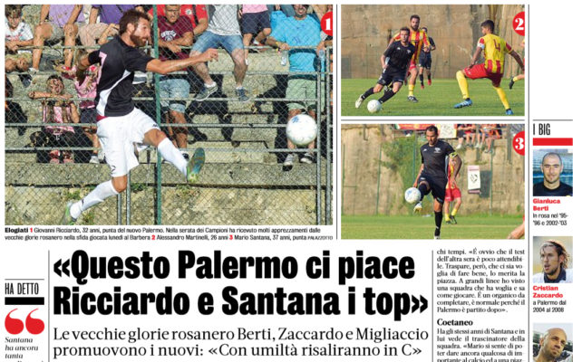 L’edizione odierna della “Gazzetta dello Sport” si sofferma sulle dichiarazioni degli ex rosa Berti, Zaccardo e Migliaccio sul nuovo Palermo: «Premetto che non conosco bene la D , però devo dire che mi è piaciuto molto Ricciardo, percepisci che per la categoria può fare molto bene, dai movimenti, dal modo come sta in area. Mi è sembrata una squadra con dei valori, credo che possa vincere il campionato. Ho rivisto con piacere Santana, ha voglia e può essere una guida di peso per tutti i compagni. I colpi ce li ha ancora e in questa categoria faranno di sicuro la differenza, senza dimenticare quello che ha dato al Palermo del passato. Può essere un carico di motivazioni in più da mettere al servizio dei compagni sia dentro che fuori dal campo». Lo segue Gianluca Berti: «Per me è una buona squadra, però si deve calare subito nella mentalità della categoria, altrimenti diventa dura. So che stanno cercando una punta importante e qualcosa la faranno. Ricciardo è un giocatore strepitoso per la categoria, Santana, non lo scopro di certo io, Mario ho già visto che è anche un grande punto di riferimento per lo spogliatoio. Poi Crivello e Lancini in difesa, Pelagotti in porta, Martinelli a centrocampo, costituiscono un’ossatura importante per la categoria, a patto che capiscano che la D è un campionato rognoso nel quale le qualità possono fare la differenza solo se si uniscono umiltà e voglia di soffrire. É tutto un fatto di testa, soprattutto i giocatori arrivati dalla B devono capirlo subito». Giulio Migliaccio afferma: «É ovvio che il test dell’altra sera è poco attendibile. Traspare, però, che ci sia voglia di fare bene, lo merita la piazza. A grandi linee ho visto una squadra che ha voglia e sa come giocare. É un organico da completare, è normale perché il Palermo è partito dopo. Mario si sente di poter dare ancora qualcosa di importante al calcio e da una piazza come Palermo. Credo nel suo contributo per riportare i rosanero almeno nei professionisti, per come l’ho visto, può essere un valore aggiunto. Mi è piaciuto anche Ricciardo, è evidente che la porta la vede molto bene, sa fare gol, lo ha dimostrato con il Cesena e mi auguro che metta la propria esperienza al servizio della squadra, perché ci sono molti giovani e in D serve l’apporto di quei giocatori che conoscono la categoria, soprattutto servirà umiltà da parte di tutti. É l’aspetto fondamentale, so che la società sta lavorando molto sotto questo aspetto, non si può pensare che le partite si vincano solo perché ci sono 20 mila spettatori sugli spalti come l’altra sera, anche se la loro presenza sarà importante».